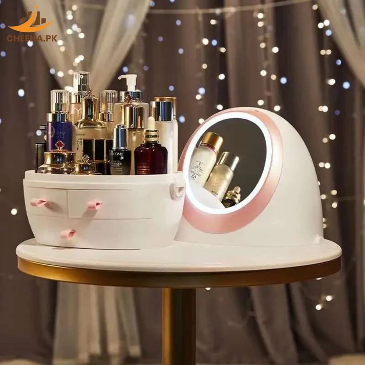 Oval Mirror Cosmetic Storage Organizer | LED Light Makeup Storage Box quantity